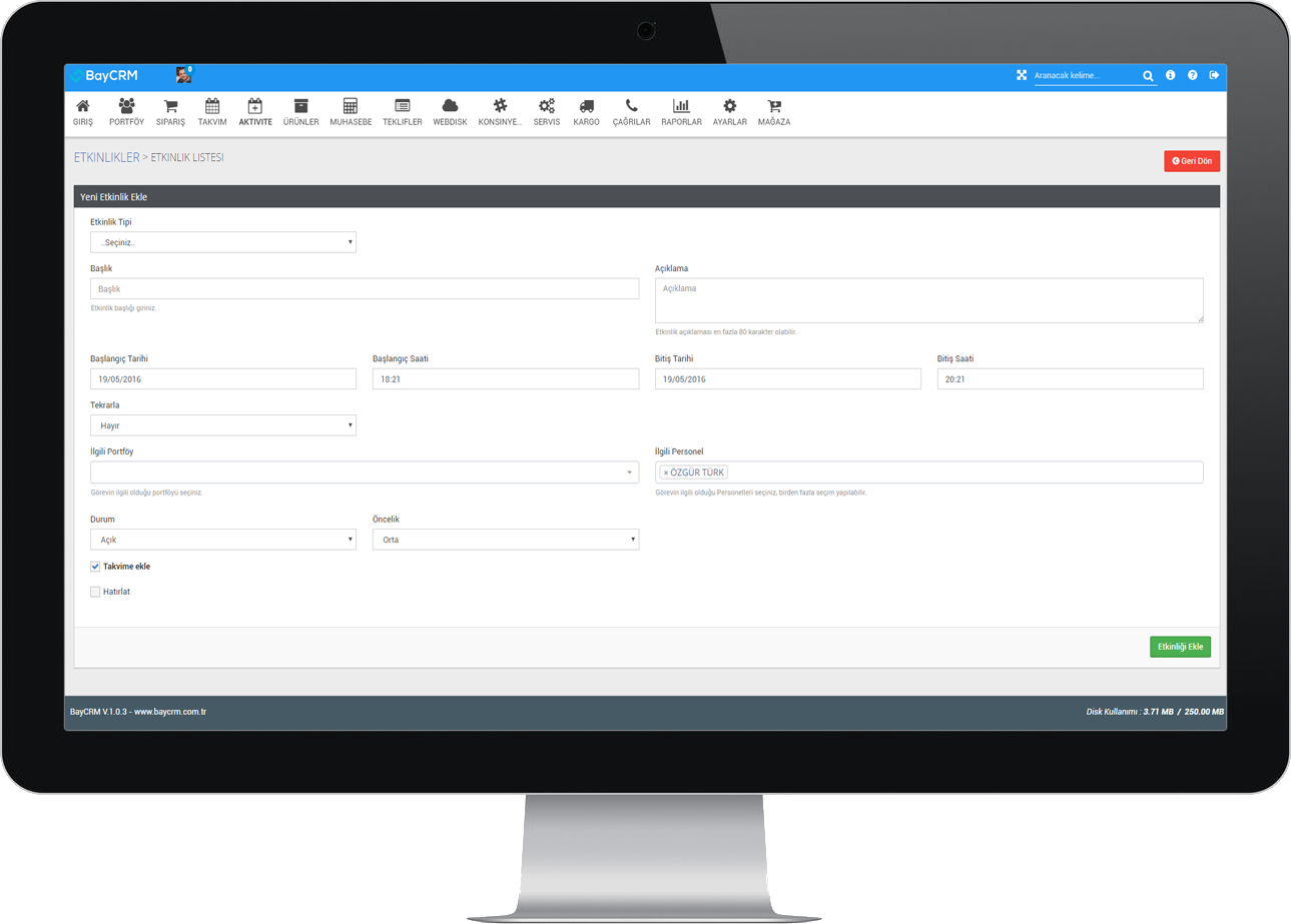 BayCRM müşteri ilişkileri yönetiminin yanı sıra bir işletmenin ihtiyaç duyabileceği teklif yönetimi, cari takip yönetimi, alış/satış faturası işlemleri, çek işlemleri ve daha bir çok özelliği içerisinde barındırır.