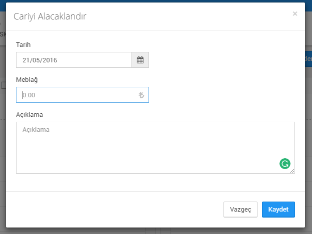 Karşınıza cari alacaklandırma formu gelecektir. Bu form üzerinden işlem tarihi, işlem tutarı ve açıklama bilgisi girilerek işlem tamamlanır.