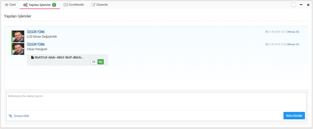 Bu ekrandan servis dosyasında yapılan işlemleri görebilir, yeni işlemler ekleyebilirsiniz. İşlem notlarına dilerseniz görsel donelerde ekleyebilirsiniz.