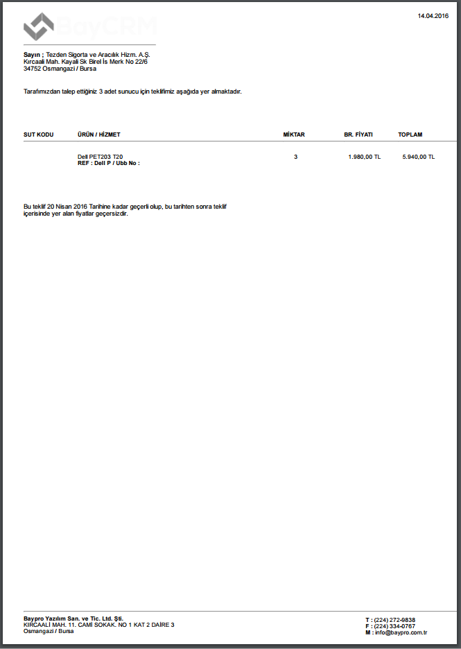 Örnek teklif formu çıktısı aşağıdaki gibi olacaktır.