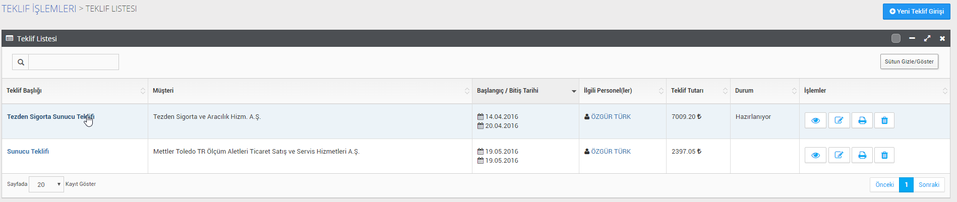Açılan sayfada daha önce oluşturduğunuz tekliflerin yer aldığı bir kayıt listesi bulunmaktadır. İşlem yapmak istediğiniz teklifin üzerine tıklanarak teklif kartı açılır.